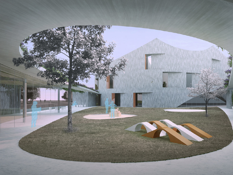 [Upper left: 2015/Playgarden: Courtyard with Classrooms That Open Onto It] [Upper right: 2010/Exhale: Public Dance Performance] [Bottom: 2015 / Cloud Seeding: 30,000 Balls Made from Recycled Plastic]