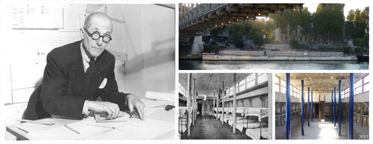 The modernist architect Le Corbusier took on the design of Asile Flottant (a floating shelter), a barge, completed in 1929, to house homeless refugees in Paris after World War I, and the Japanese architect Maekawa Kunio, who was studying at his atelier at the time, was placed in charge of the project.