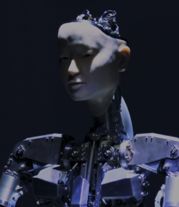 The Alter android line was developed in 2016 in order to research not what can be done by automation, but rather how human beings would react to an autonomous robot. It is being pursued jointly with the University of Tokyo and Osaka University in order to explore fundamental questions of whether robots can obtain a sense of life, and what life itself may mean. Alter is not intended to be an android identical in appearance to human beings. Rather, only the face, neck, and arms up to the elbows are outfitted with prosthetic skin. The other parts are exposed machinery, with forty-two actuators (a computer-controlled system using compressed air) moving like joints. These movements are not pre-programmed, but rather based on a central pattern generator (CPG), which functions like the human spinal cord, and a neutral network of 1,000 simulated neurons that fire in real-time. In addition, optical and distance sensors allow for autonomous and spontaneous movement, creating a profusion of actions based on reacting to the surrounding people and environment. This results in unexpected movements even the developers could not foresee, and the memory of these actions in turn allows Alter to continue evolving. The name Alter comes from the concept of internal change and transformation of the android, as well as the notion of a second self, or “alter ego,” and the idea of this being an “alternative” form of expression and life. Alter 3 is the third generation in this line. New cameras have been installed in the eyes, and the mouth is now capable of producing sound, with dynamic movement also incorporated. In addition, it comes equipped with the ALIFE Engine™, a dynamics generation engine, with the operating system and all aspects of the robot software having been developed by the Alternative Machine Inc.