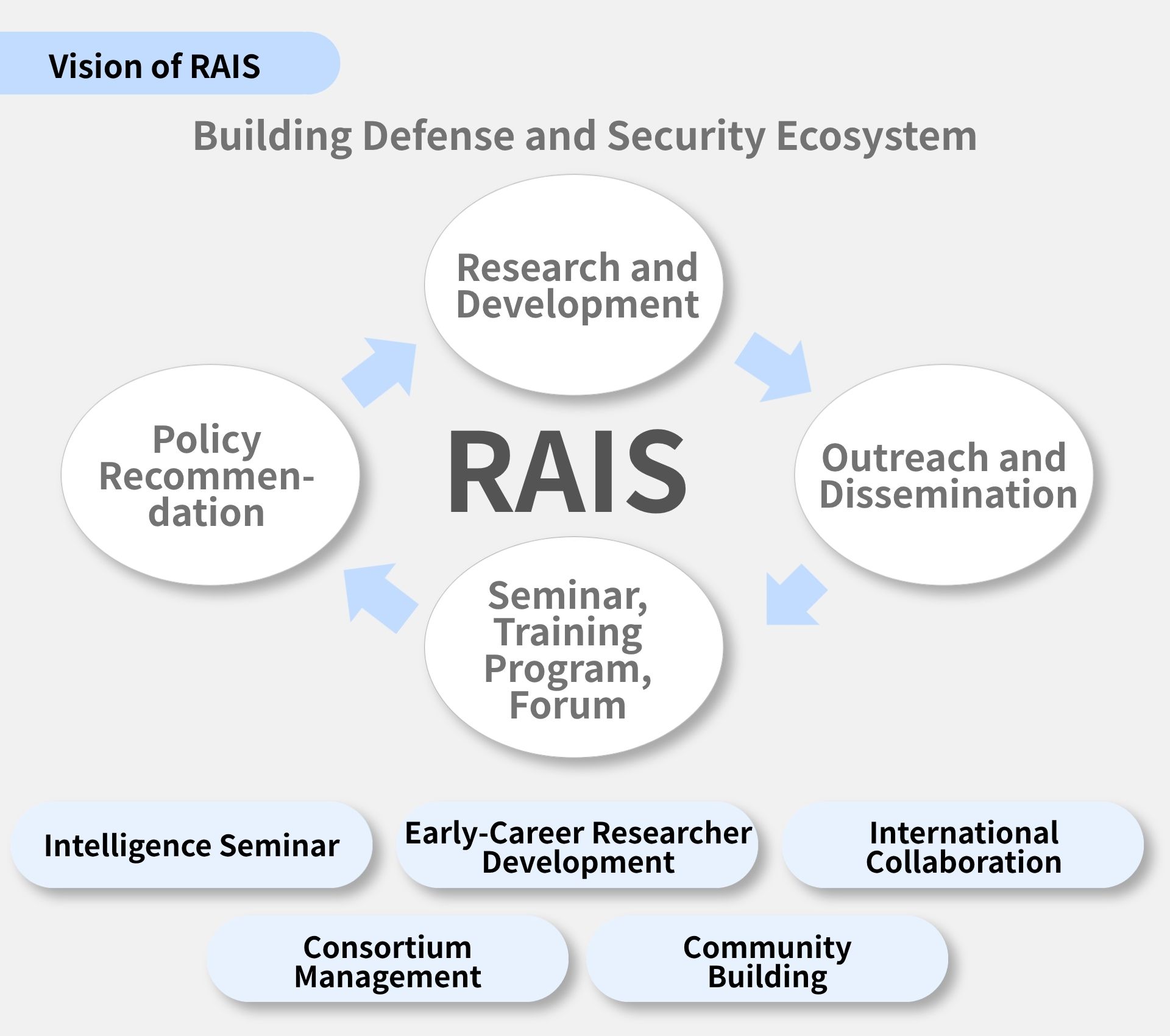 RAIS pursues an integrated approach to research, policy advocacy, and industry collaboration at the intersection of advanced technology and national security — with the goal of building a security innovation ecosystem in Japan.