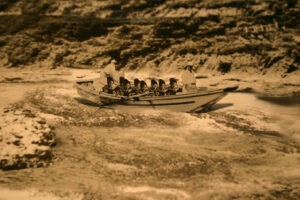 Eight costumed violin players were gathered in one of the long wooden boats which regularly ply the Hosotsu River. As they descended the river, all the violins entoned just a single note, B flat.The idea of the project was to recreate the topography of the river through sound. The stretch of river between Kameoka and Arashiyama contains both violent rapids and areas of calm water, so the actual tone altered as the boat rocked back and forth through the rapids or softly glided over the still sections. This creative and intellectually stimulating work met with a very successful premier and will eventually be made commercially available.
