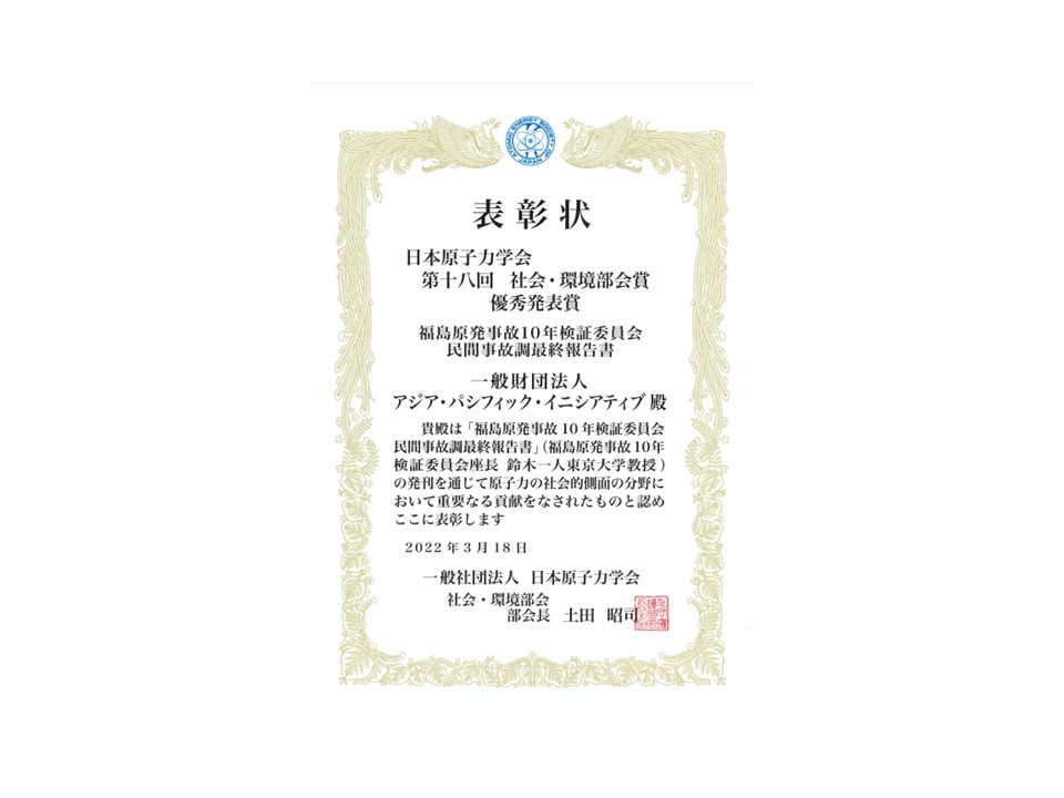 一般財団法人アジア・パシフィック・イニシアティブ(所在地:東京都港区、理事長:船橋洋一。以下API)は2022年3月18日、日本原子力学会・社会環境部会より、第18回社会・環境部会賞優秀発表賞を受賞しました。