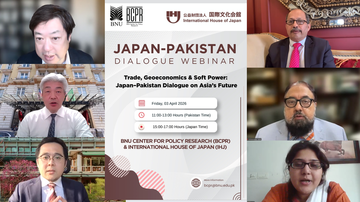 2026年4月3日、国際文化会館(IHJ)とパキスタン・ビーコンハウス国立大学(Beaconhouse National University, BNU)政策研究センター(Center for Policy Research, BCPR)は、日本・パキスタン対話ウェビナーをオンラインで共催しました。本ウェビナーには、日本およびパキスタンの研究者・政策関係者が参加し、アジアにおける地経学の動向、地域連結性、ならびに文化外交と学術協力の役割について意見交換が行われました。